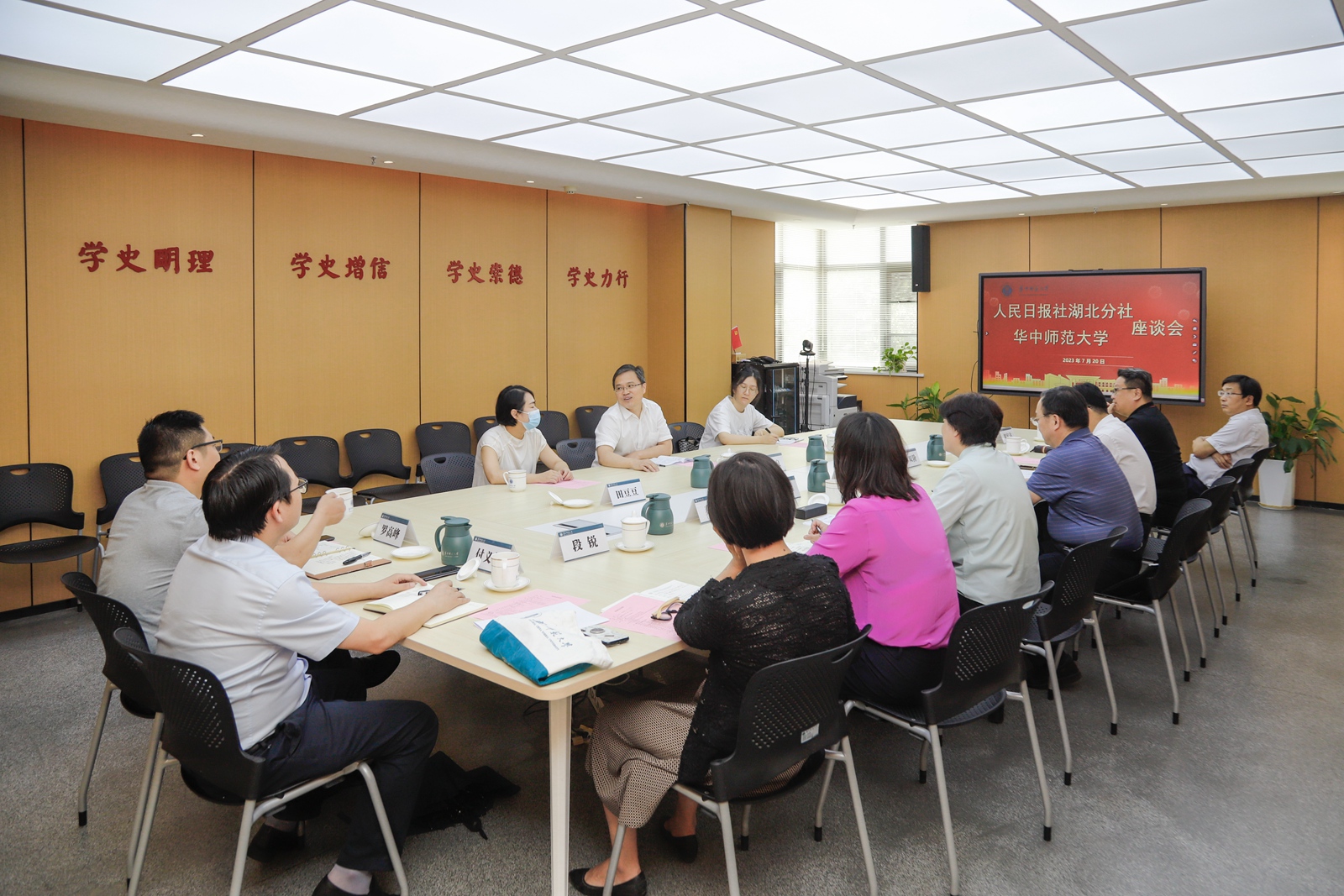 华大在线讯(记者 华轩)7月20日,人民日报社湖北分社社长禹伟良一行来访。校党委书记夏立新、校长郝芳华、副校长彭双阶在9号楼6楼融媒体中心会议室就新闻宣传、校社合作等与对方进行座谈交流。座谈会由郝芳华主持。