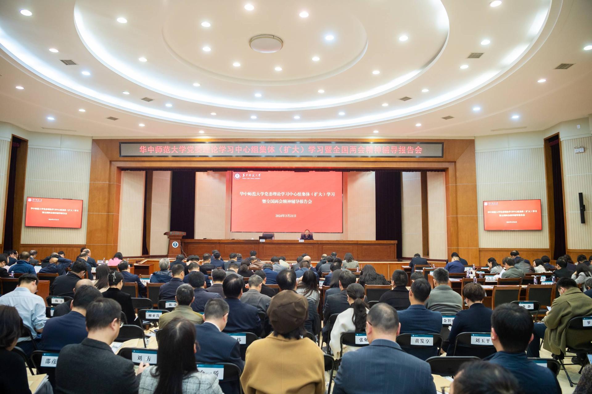 华大在线讯(记者 华轩)3月21日,开云新人注册88元_开云(中国)在科学会堂一楼报告厅举行校党委理论学习中心组集体(扩大)学习暨学习贯彻全国两会精神辅导报告会,深入学习贯彻2024年全国两会精神。校党委常委,全体中层干部,各级人大代表和政协委员、各民主党派基层组织和侨联负责人,各涉老组织负责人和师生代表参会。会议由校党委书记夏立新主持。