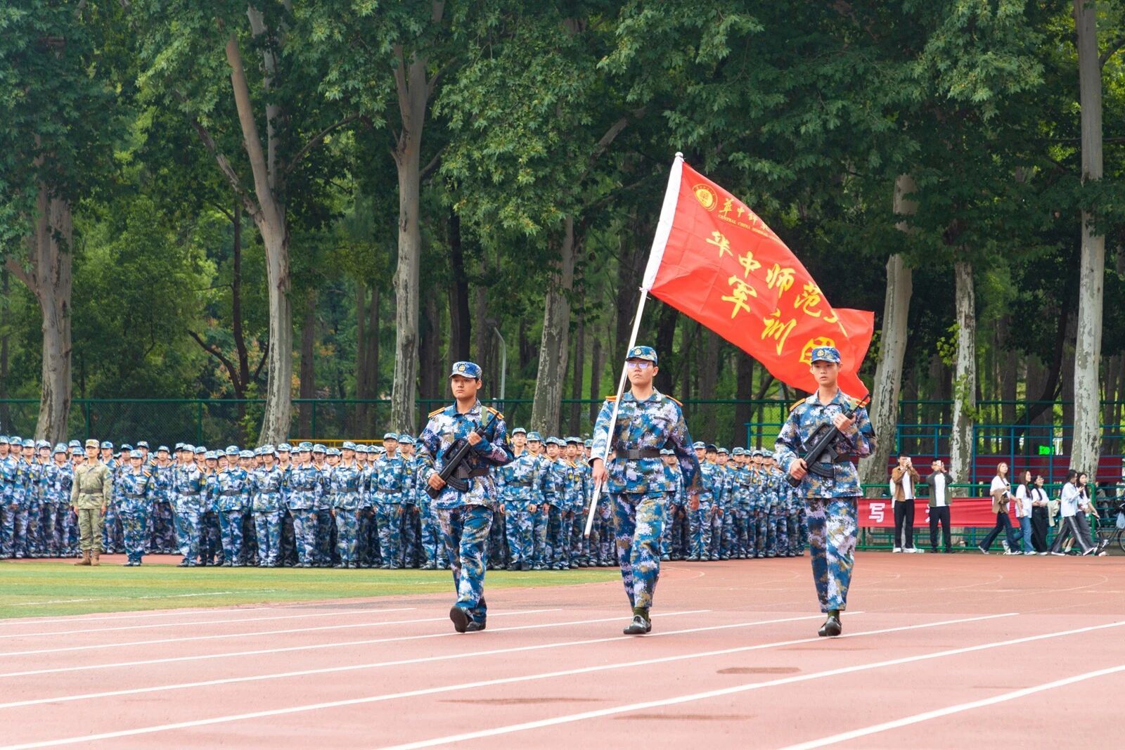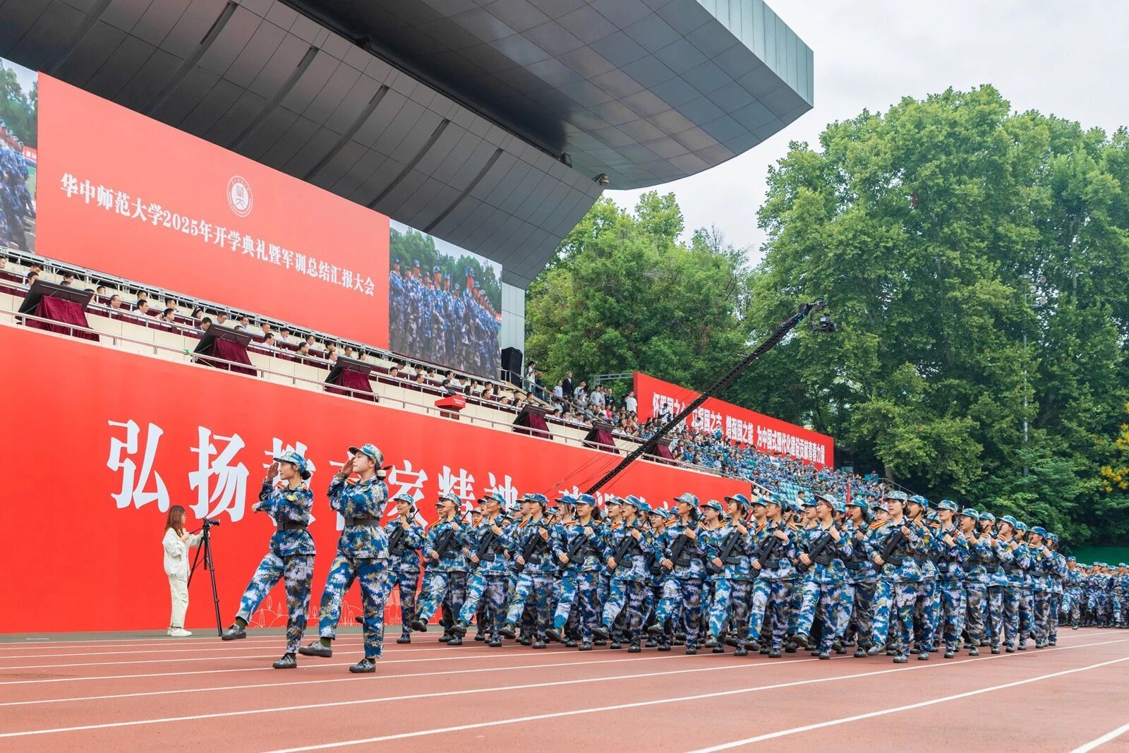 开学典礼后,2025级本科新生进行军训总结汇报表演。由各连队选派的优秀学员组成的方阵正步走过主席台。整齐的步伐踏出青春的坚毅,嘹亮的口号传递昂扬的力量。各方阵带来破锋八刀、匕首操、应急棍术、战术综合演练等表演项目,学员们挥臂出拳皆带千钧力道,转身踢腿尽显利落姿态,招式衔接更藏十足默契,展现了军训磨砺的扎实成果,定格下桂子新人的奋进印记。