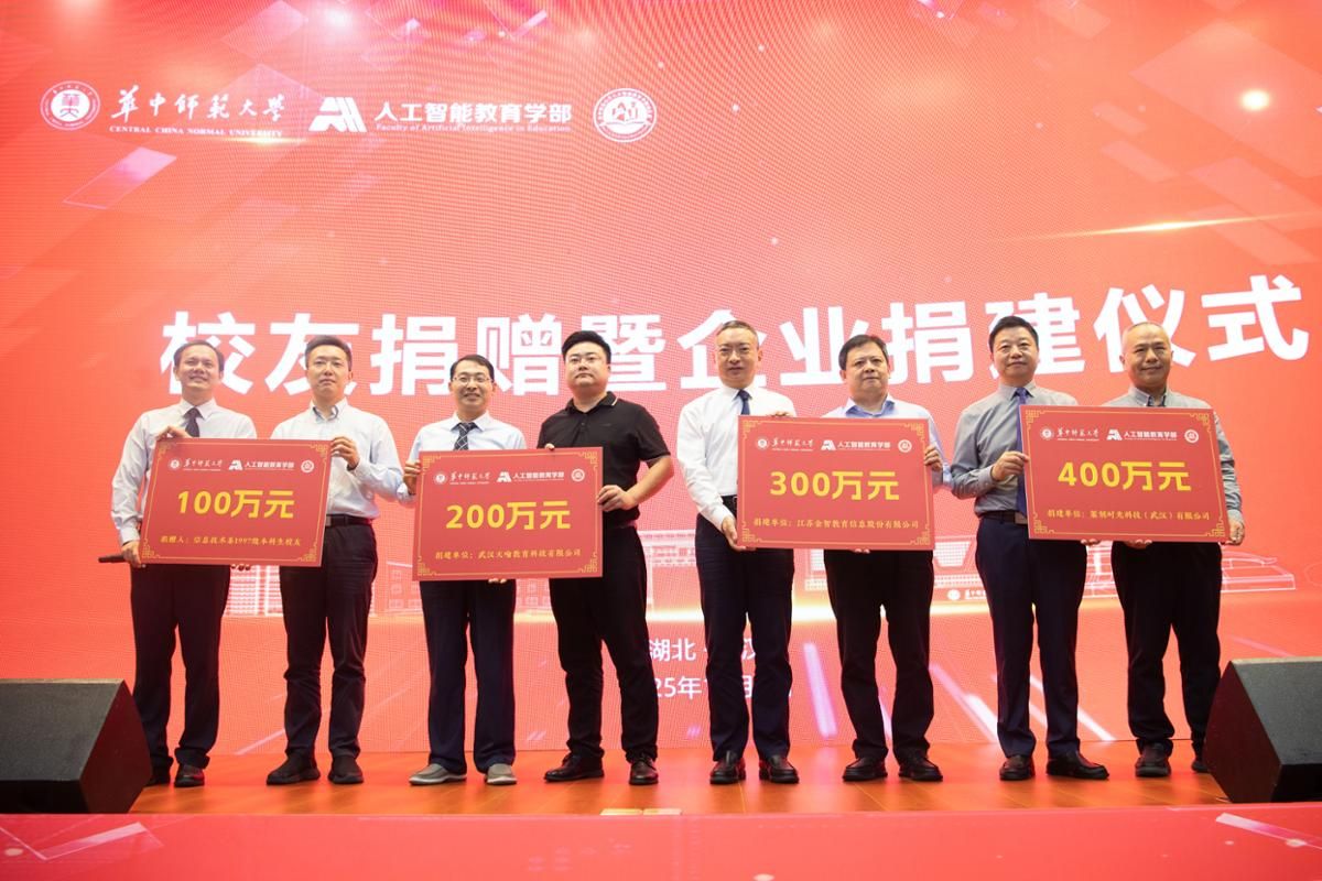 1997级信息技术系本科校友代表,篆刻时光科技(武汉)有限公司董事长王占军先生,武汉天喻教育科技有限公司刘拥纲,江苏金智教育信息股份有限公司田桥上台授牌,为学部科研与教育事业捐资助学。