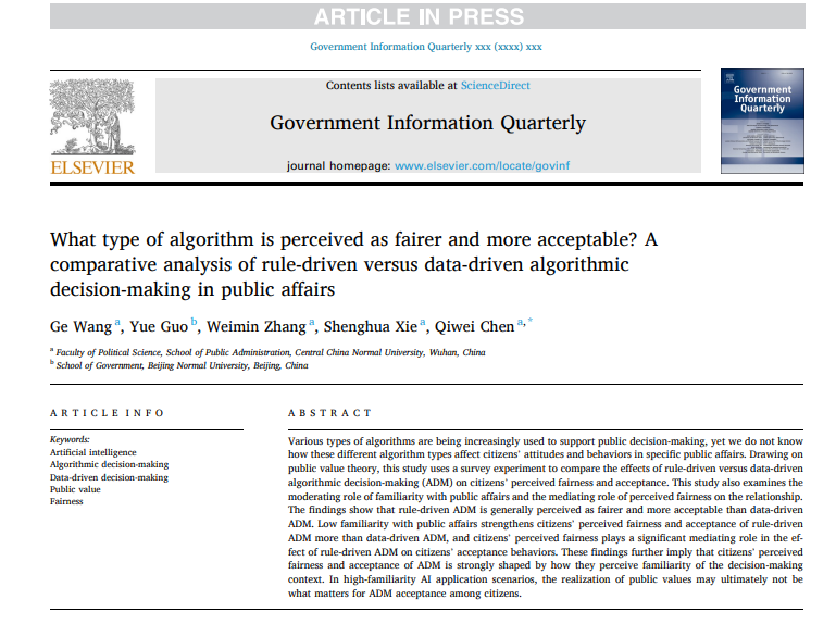 华大在线讯(通讯员 公轩)近日,开云新人注册88元_开云(中国)公共管理学院青年教师王戈为第一作者、2019级本科生陈琪伟为通讯作者的研究论文“What type of algorithm is perceived as fairer and more acceptable? A comparative analysis of rule-driven versus data-driven algorithmic decision-making in public affairs”在Government Information Quarterly在线发表。Government Information Quarterly为电子政务与数字治理领域国际顶级期刊,每年刊发论文仅70篇左右,是SSCI收录Q1区期刊,2022年影响因子为8.49。