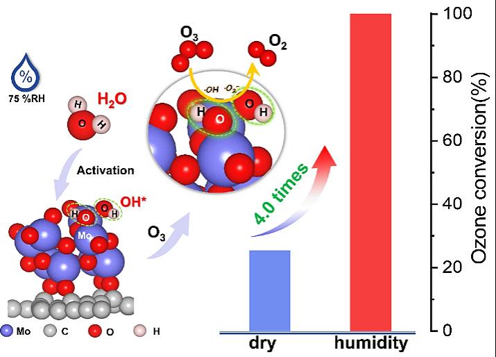 高湿度环境下臭氧在氧化钼/石墨炔纳米墙分解机制研究示意图