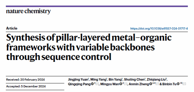 华大在线讯(通讯员 周汉鸣)近日,化学学院涂斌斌副教授团队在金属有机框架序列调控方面取得了重要进展。该研究成果在国际化学领域权威期刊《自然化学》(Nature Chemistry)发表,题为“Synthesis of backbone variable pillar-layered metal–organic frameworks through sequence control”(Nat. Chem. 2025, 17, 421-428)。博士研究生元静静为论文第一作者,通讯作者为武汉科技大学庞青青讲师、万明宇特任教授、郑安民教授和开云新人注册88元_开云(中国)涂斌斌副教授(最后通讯作者),第一完成单位为开云新人注册88元_开云(中国)。