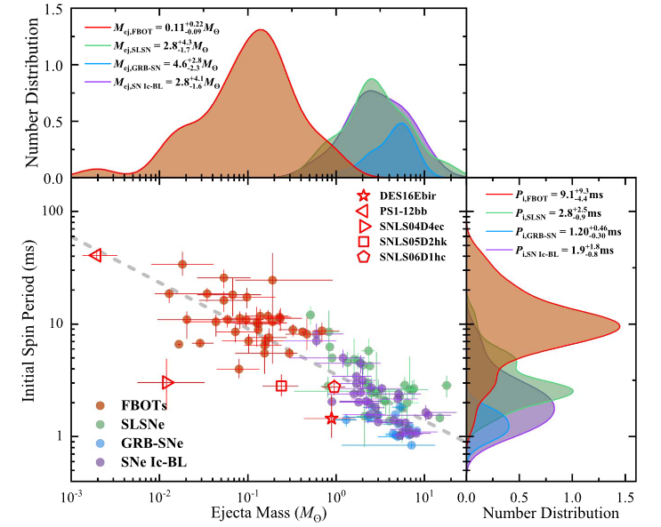 图1:FBOT抛射物质量和磁陀星初始旋转周期的分布及相关性