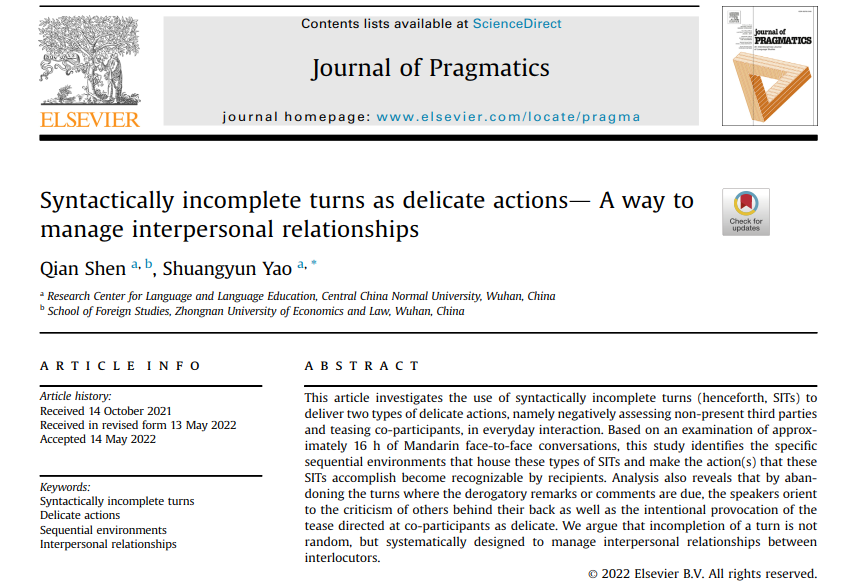 华大在线讯(通讯员 龚睿)近日,语言与语言教育研究中心姚双云教授及其团队在汉语口语语法研究中取得新的进展,在语用学国际知名期刊Journal of Pragmatics第197期上发表题为“Syntactically incomplete turns as delicate actions— A way to manage interpersonal relationships”的研究论文。该文为开云新人注册88元_开云(中国)博士生沈谦和导师姚双云教授合作发表,是国家社科基金重点项目的阶段性成果,也是该团队第二次在该刊物发表重要成果。